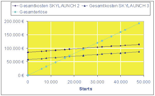 | SKYLAUNCH 2: | 8,2 l Propanmotor, Seillebensdauer jeweils 4000 Starts, Seilrollen-Lebensdauer 40.000 Starts, Treib- und Schmierstoff 0,50 € pro Start, Serviceteile und Betriebsflüssigkeiten nach Handbuch, Erlös pro Start 4 €| SKYLAUNCH 3: | dto., jedoch 7,4 l Propanmotor